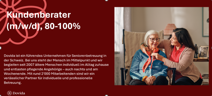 Dovida ist ein führendes Unternehmen für Seniorenbetreuung in der Schweiz. Bei uns steht der Mensch im Mittelpunkt und wir begleiten seit 2007 ältere Menschen individuell im Alltag zuhause und entlasten pflegende Angehörige – auch nachts und am Wochenende. Mit rund 2'000 Mitarbeitenden sind wir ein verlässlicher Partner für individuelle und professionelle Betreuung.
