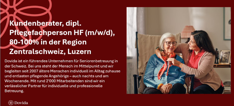 Zur Verstärkung unseres Teams in Luzern suchen wir eine engagierte und herzliche Persönlichkeit, die bereit ist, mit uns neue Wege zu gehen und zu wachsen. Werden Sie Teil der Dovida Familie, per sofort oder nach Vereinbarung als